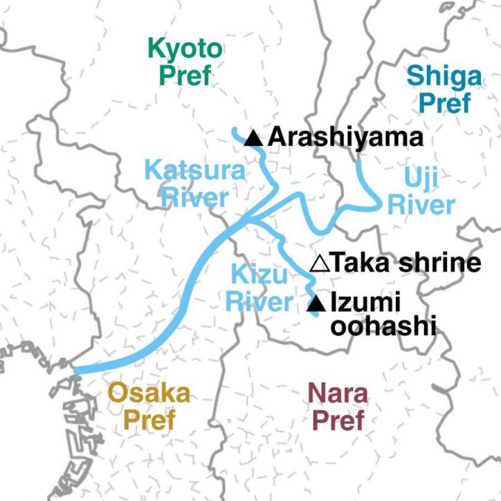Kizu River joins Uji River and Katsura River at downstream and becomes Yodo River, which flows down to the sea at Osaka Bay.