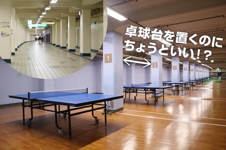 今回最大の謎、どうして地下通路に卓球場を作ったのかを聞いてみた。「柱と柱の間に、ちょうど卓球台が置けるやないか、という話があったと聞いてますね」と会社では、“卓球台ジャストサイズ説”が あるとのこと。なるほど、確かにここは地下を支える柱が等間隔にあって、広いスペースとはいえオープンには使えない。まさに卓球台を置くのにベストな空間だ。謎が解けた!……と、この時は思った。