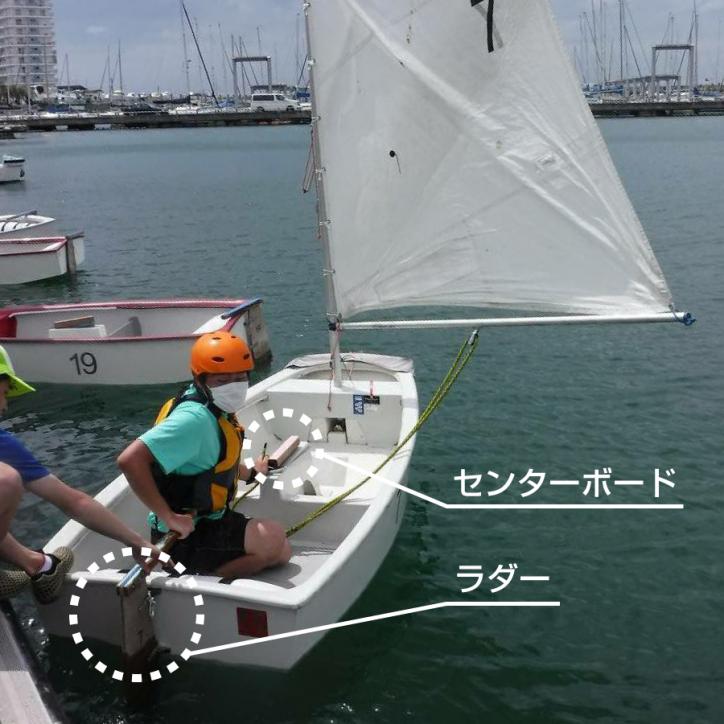 操縦は、片手にラダー(舵)、もう片手にセールのロープを持っておこないます。ラダーは後ろ手になるので最初は少しとまどうかもしれません。風の向きでセール(帆)の向きがかわると、身体の向きもかえていきます。