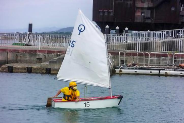 ヨットの方向転換をする時は体も一緒に移動するので、体験用のOPヨット(子ども用)だと、体格が大きい人は少し動きづらいかもしれません。