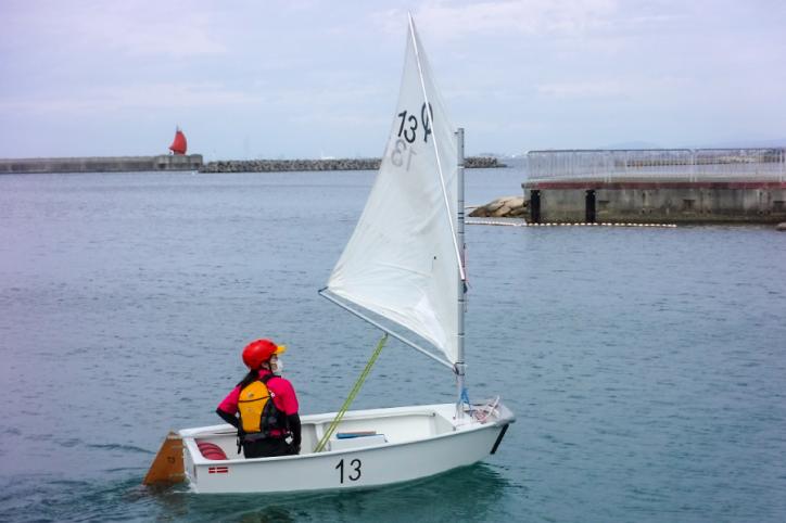 体験できるのは、OPヨット。OPとは、オプティミスト(Optimist = 楽天家)のことだそう。全長2.31m、全幅1.13mの小さな子ども用のヨットです。強風下でも強い安定性が保たれて安心して操船できるため、ヨットの入門挺といわれています。