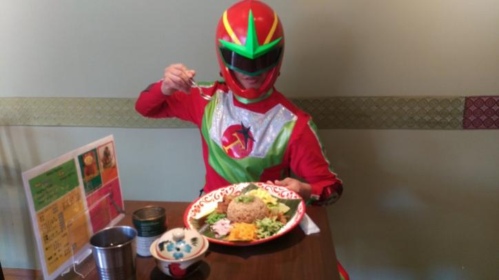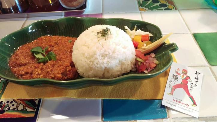 トマティーン 活動が上手くいかず悩んでいた時代、このお店の「トマトカレー」というメニューに惹かれて入ったのがきっかけです。一口食べてその味に虜になりました。思わず店長の原口さんにカレーに感銘を受けたことを伝え、自分がトマトのヒーローであることを打ち明けました。トマト繋がりで何か協力が出来ないかと相談したところ、地球での最初の理解者として支えて下さるようになったと言うのが経緯です。美味しいうえに野菜やスパイスがいっぱい入った栄養満点のカレーは、メタボリック将軍を倒すため非常に強力な武器になります。僕もいつもカレーでパワーをチャージしています。