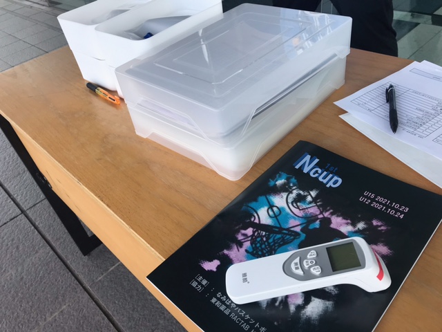 関係者がスムーズに入場できるよう、受付は4ヵ所設置され。入場者を分散する工夫がされていました。私もそこで、一人一人非接触タイプの体温計を片手に赤外線を打ちまくります。