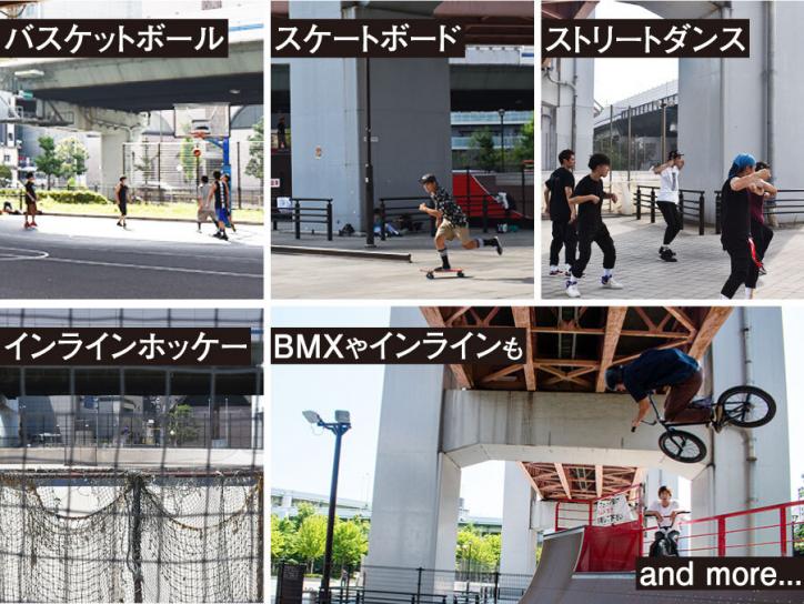 ニュースポーツ広場では、BMX(バイシクルモトクロス)、バイクポロ、インラインスラローム、アグレッシブインライン、インラインホッケー、スケートボード、ストリートバスケット、ストリートダンス、ブラインドサッカー、ジャグリングと多種多様なスポーツができる。