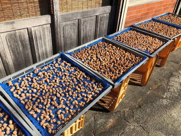 そう!日本食の一つであり和歌山県が名産の「梅干し」です。自分の家で梅の畑を持ち、自分の家で梅干しや梅酒を作る人が多い和歌山ならではの光景です。上富田には他にも、みかんやすももなどの果物も栽培をされている方々が多くいます。