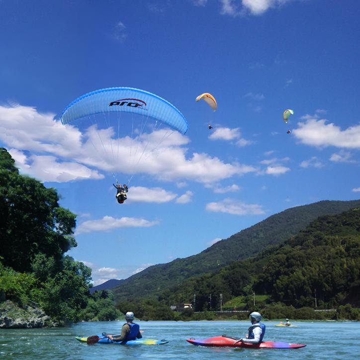 テントを立ててひと息したあと、南の空を見上げると目の前の百合山から竹房橋東に降りてくるパラグライダーをすぐ近くで見ることができます。