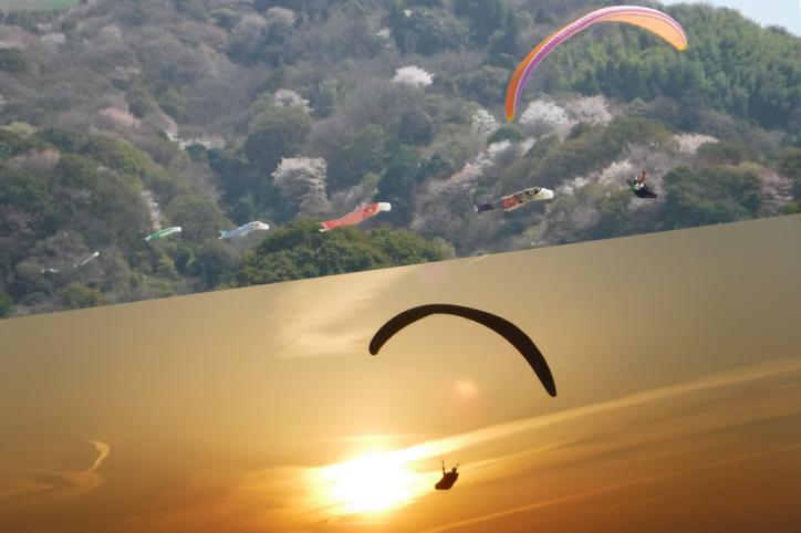 ひとりで飛んでいるのを見ると気持ち良さそうと清々しい気持ちにさせてくれます。また、数人が色とりどりのパラグライダーで飛んでいるのを見ると、まるで「空を奏でる花びら」のようで優雅な気持ちになります。5月にはパラグライダーに鯉のぼりを付けて人も鯉も空を泳いでいるように降りてきます。夕日に包まれたパラグライダーを見上げるのは圧巻です。