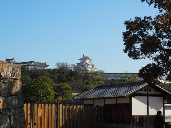 姫路城を望む日本庭園「好古園」の奥に見える姫路城。360度の順で考えると「西側、真横からの姫路城」の姿を飛ばしていますが、実はお城の西側はお堀や樹木が多く、外周からしっかり見ることはできませんでした。