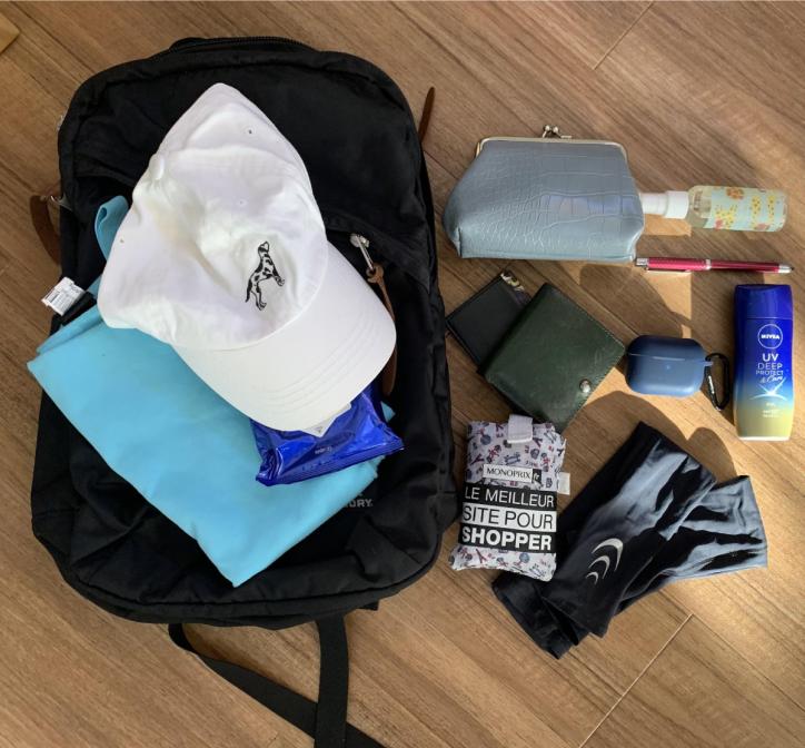 今回の私の手荷物はこちら。この写真にプラス携帯と飲み物で終了です。長時間の旅なので荷物は気持ち少なめに。