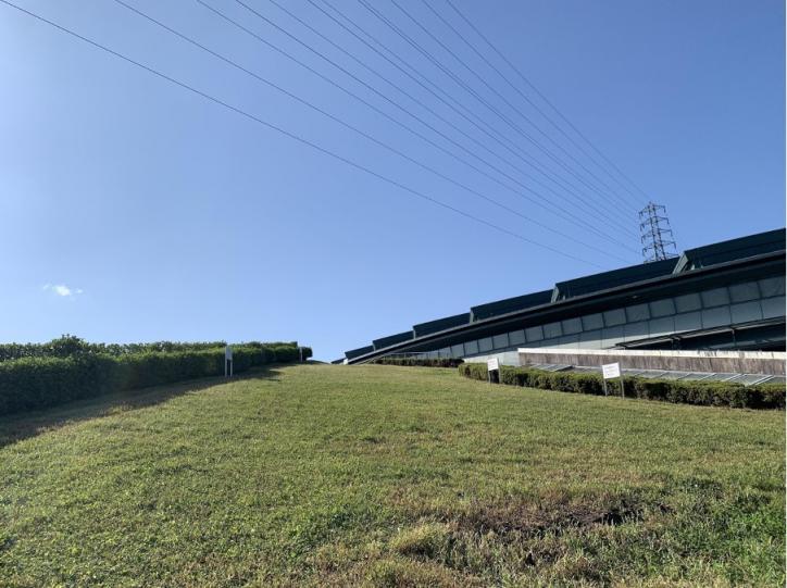 さて、ストレッチをするために競技場の横にあるアクアリーナの芝生広場に移りましょう。