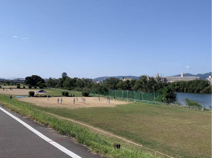 河川敷公園ではサッカー少年や野球少年たちが練習中。
