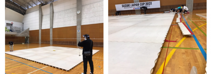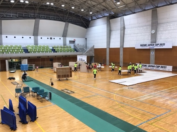 大会当日に選手が心おきなく演技ができるよう、何もない体育館に舞台や設備を設置していきます。