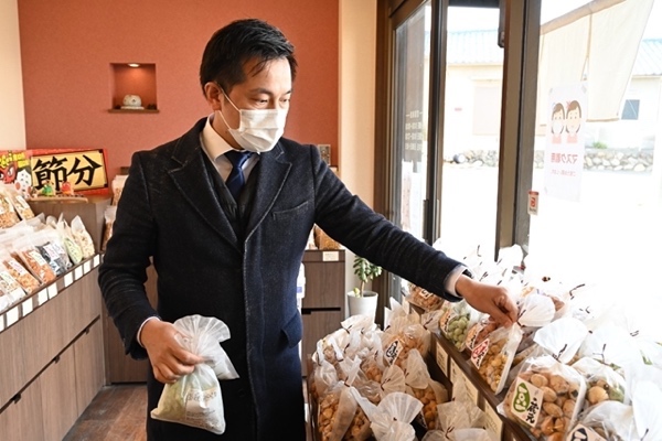 今回『豆の蔵元』に同行してくださった河内長野市議会議員の奥村亮さんも、真剣に鬼豆と豆菓子を物色されていました。
