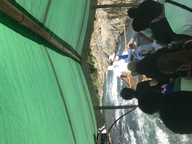 前方に2名の船頭さんがいて、1人は川底や岩に竿を押し当てながら進路を、もう一人はオールを漕ぎながら、各スポットの解説とトークで盛り上げてくれて、吉本の芸人さんなみのお笑いセンスで客のいじり方が上手い!