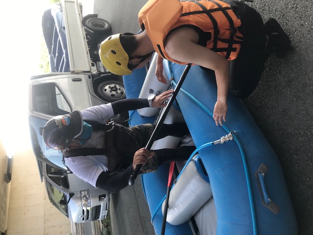 乗船場でまずはウエットスーツとライフジャケットに着替えて、ヘルメットと専用シューズを装着。ガイドの方からのパドルの操作や川に落ちた時の動きについてのレクチャーをしっかり教わる。この辺りから川下りとは違って場合によっては命の危険を感じることがあるかもと少し緊張感が。(大袈裟です…笑)